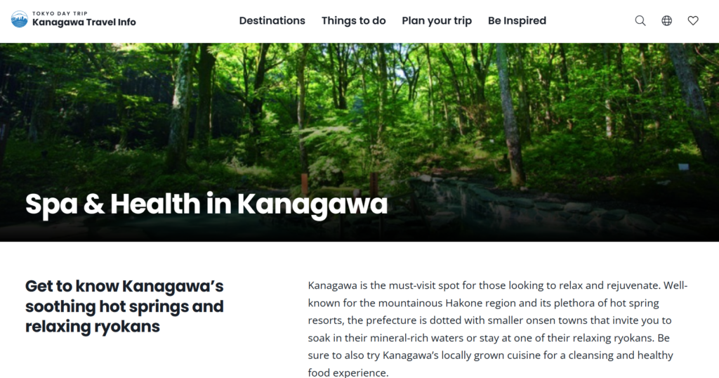 本県には箱根や湯河原に加え、カルシウムが豊富な鶴巻温泉、信玄の隠し湯として有名な中川温泉など、県内各地に魅力的な温泉地が点在しています。そこで、昨年度こうした各地の温泉の特徴ある泉質の紹介や、周辺の観光スポットと組み合わせたモデルコース等を掲載するガイドブック「神奈川湯めぐり旅」を作成しまして、観光情報ウェブサイトでも発信をしています。