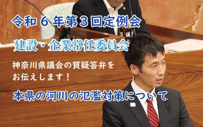 会議日:令和6年12月10日【建設・企業常任委員会】流域治水の取組や河川の活用について佐藤けいすけ今回の代表質問で、「台風10号による河川の氾濫を踏まえた流域治水の取組み」の質問に対して、知事から、被災した地域で地域の関係者による検討会議を新たに設置すると答弁がありましたが概要を詳しく教えていただきたい。河港課長県は、台風10号により氾濫した二宮町の葛川や、 平塚市